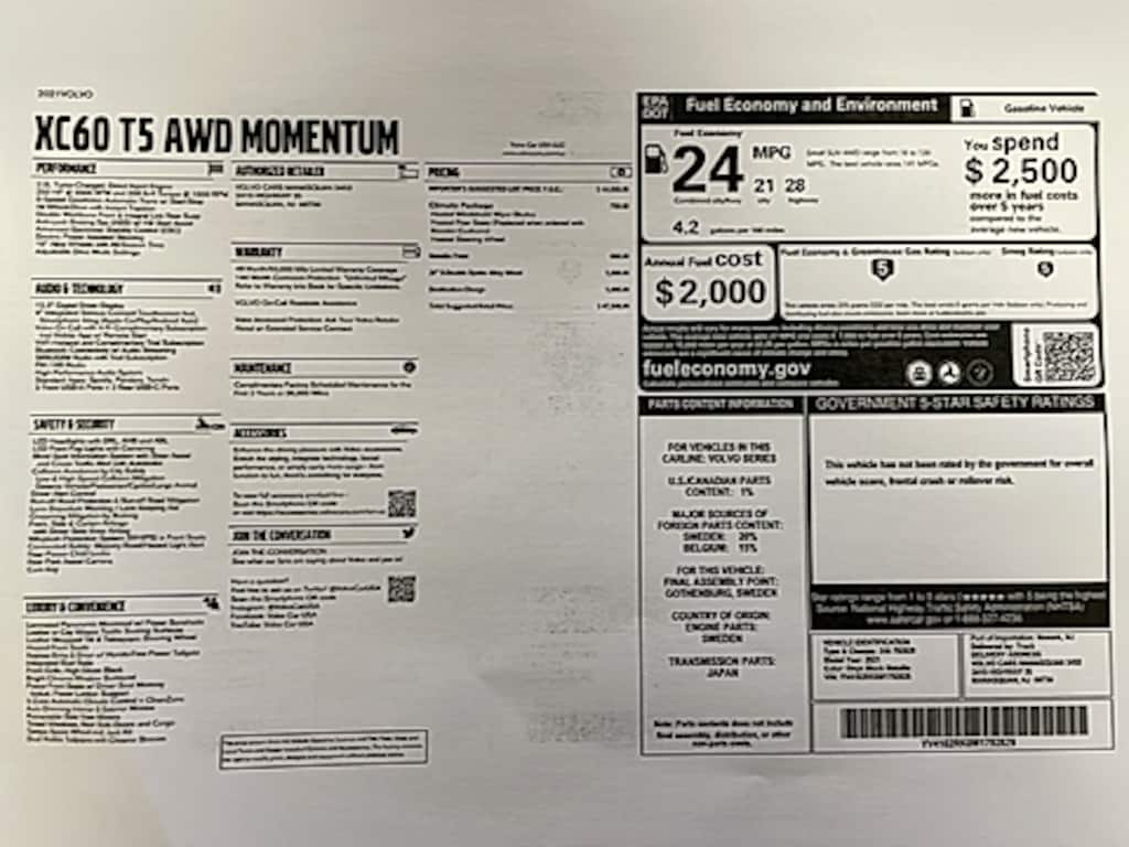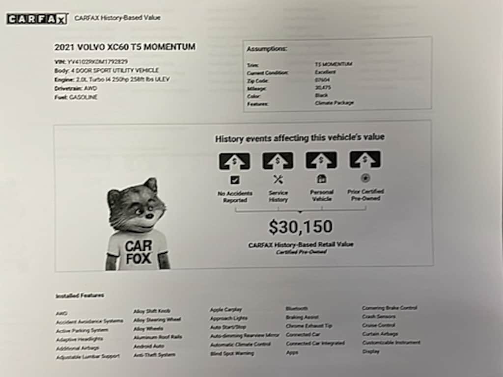 Kundert Volvo Cars Shopping Experience Rises above the Rest THIS ONYX BLACK 2021 XC60 MOMENTUM T5 AWD HAS ONLY 30,000 MILES AND WAS JUST RECENTLY TRADED IN BY OUR CUSTOMER THAT HAD PURCHASED IT. IT IS IN TERRIFIC CONDITION ( COSMETICALLY AND MECHANICALLY ) AND HAS A CLEAN CAR FAX AND A TERRIFIC SERVICE HISTORY WITH OUR SERVICE DEPARTMENT. IT IS EQUIPPED WITH ALL STANDARD FEATURES ALONG WITH GRAPHITE LEATHER INTERIOR, CLIMATE PACKAGE, 20' DOUBLE SPOKED ALLOY WHEELS AND MORE. A COPY OF THE ORIGINAL WINDOW STICKER CAN BE VIEWED IN THIS LISTING'S PICTURE SECTION. THIS ELEGANT XC60 IS BEING SOLD WITH THE BALANCE OF VOLVO'S CERTIFIED WARRANTY. Kundert Volvo - Proudly Serving Our Community since 1944