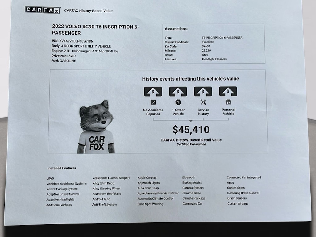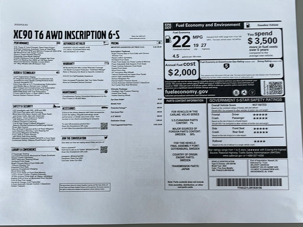 "Kundert Volvo Cars Shopping Experience Rises above the Rest THIS PINE GREY METALLIC 2022 XC90 T-6 INSCRIPTION 5-SEATER HAS ONLY 23000 MILES AND WAS ORIGINALLY PURCHASED NEW FROM OUR DEALERSHIP AND HAS ONLY BEEN SERVICED WITH US TOO! IT IS A O NE OWNER VEHICLE WITH A CLEN CAR FAX.I ADDITION TO ALL OF THE TERRIFIC FEATURES THAT THE INSCRIPTION PACKAGE OFFERS, THIS SIX PASSENGER HAS: CLIMATE PACKAGE, PROTECTION PACKAGE, PARK ASSIST PILOT, 21"" ALLOY WHEELS AND MORE! ALL FEATURES CAN BE VIEWED IN THIS LISTING'S PICTURE SECTION. THIS ELEGANT XC90 IS BEING SOD VOLVO CERTIFIED. THAT COVERAGE IS GOOD THROUGH: SEPTEMBER 6TH OF 2027 WITH UNLIMITE MILEAGE. Kundert Volvo - Proudly Serving Our Community since 1944"